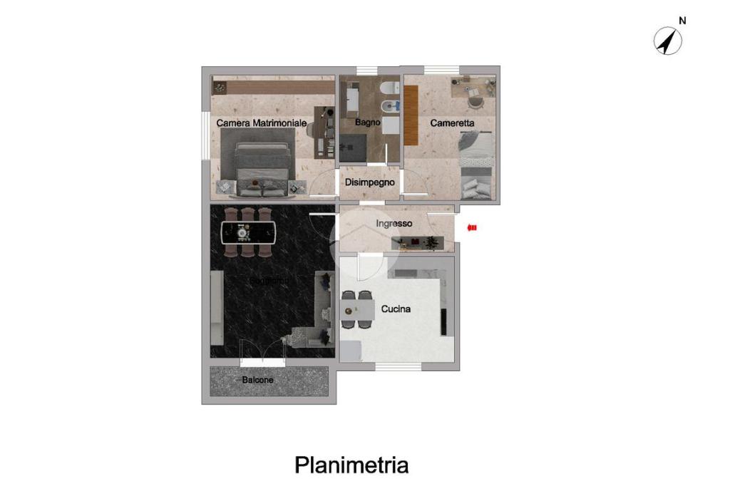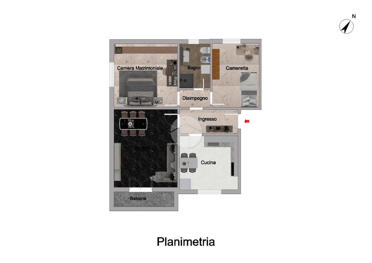 Disimpegno D'Ingresso, Ampia Cucina Abitabile, Soggiorno con Balcone, Disimpegno Zona Notte, Spaziosa Camera Matrimoniale, Bagno Finestrato con Doccia e Cameretta.